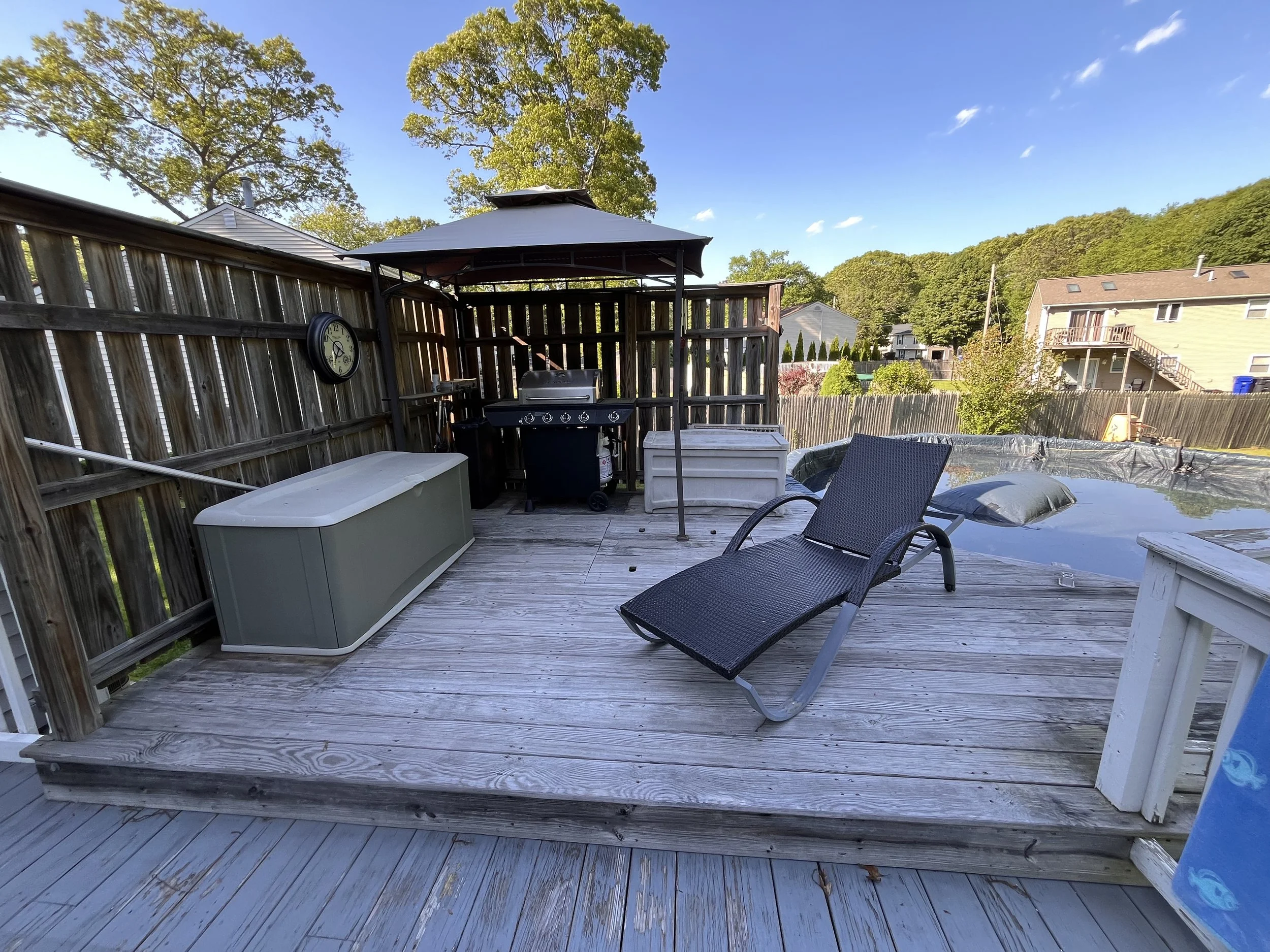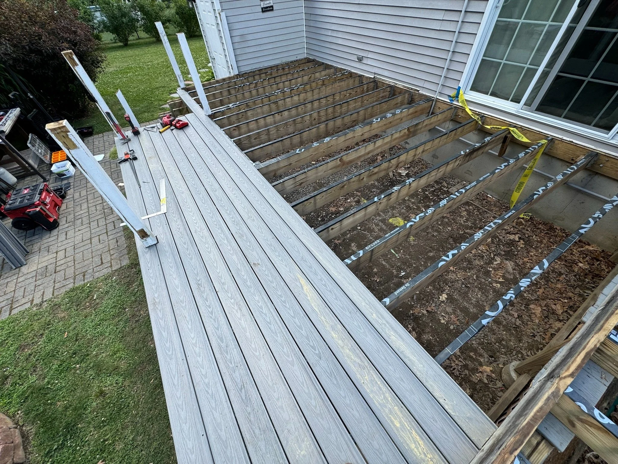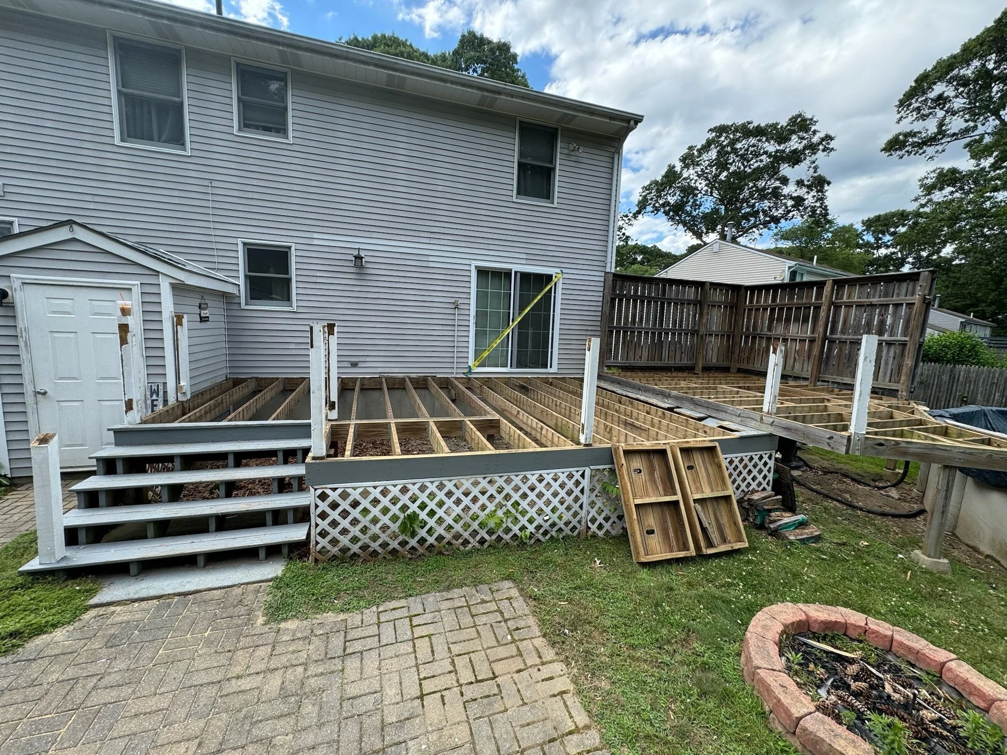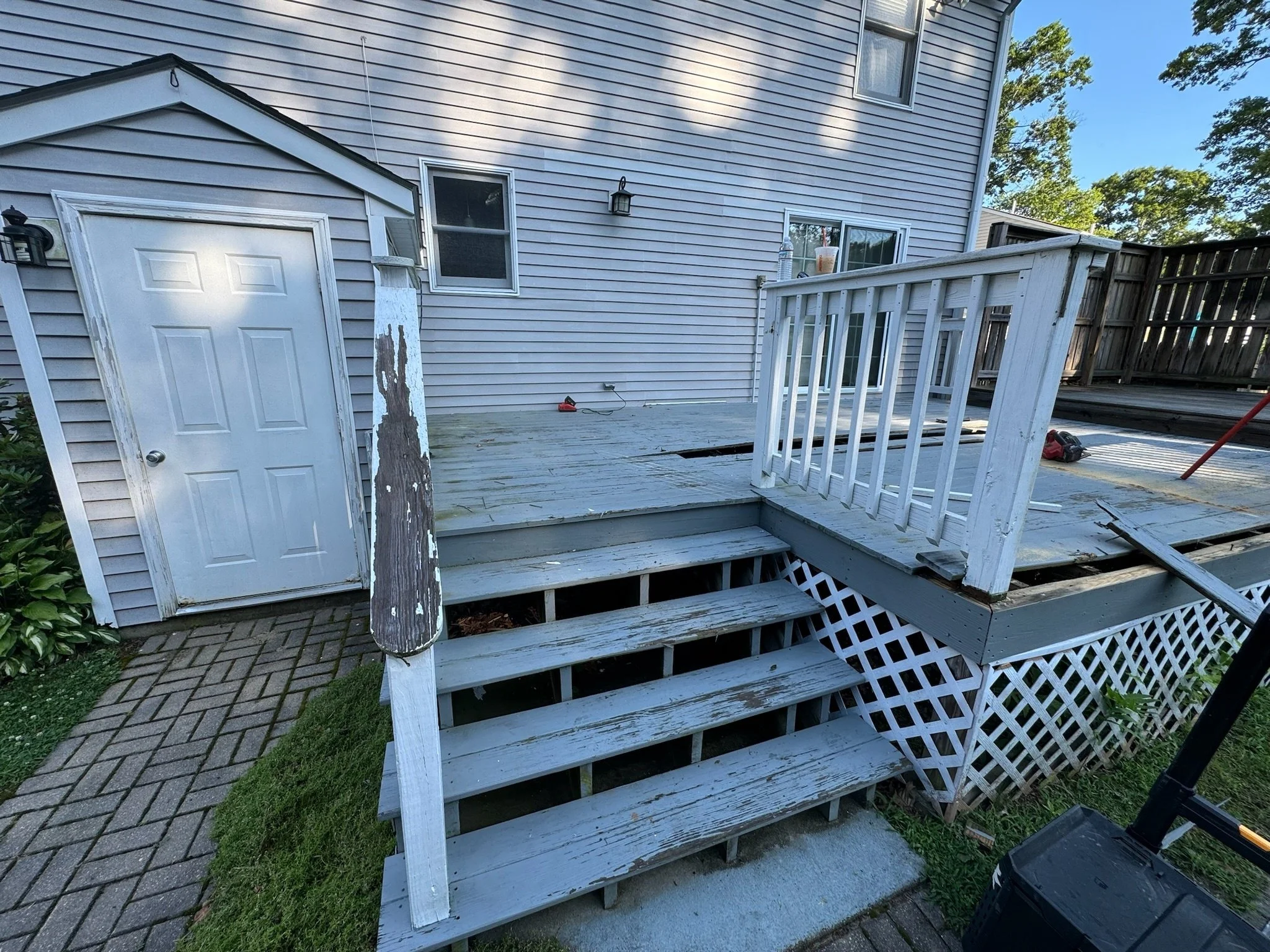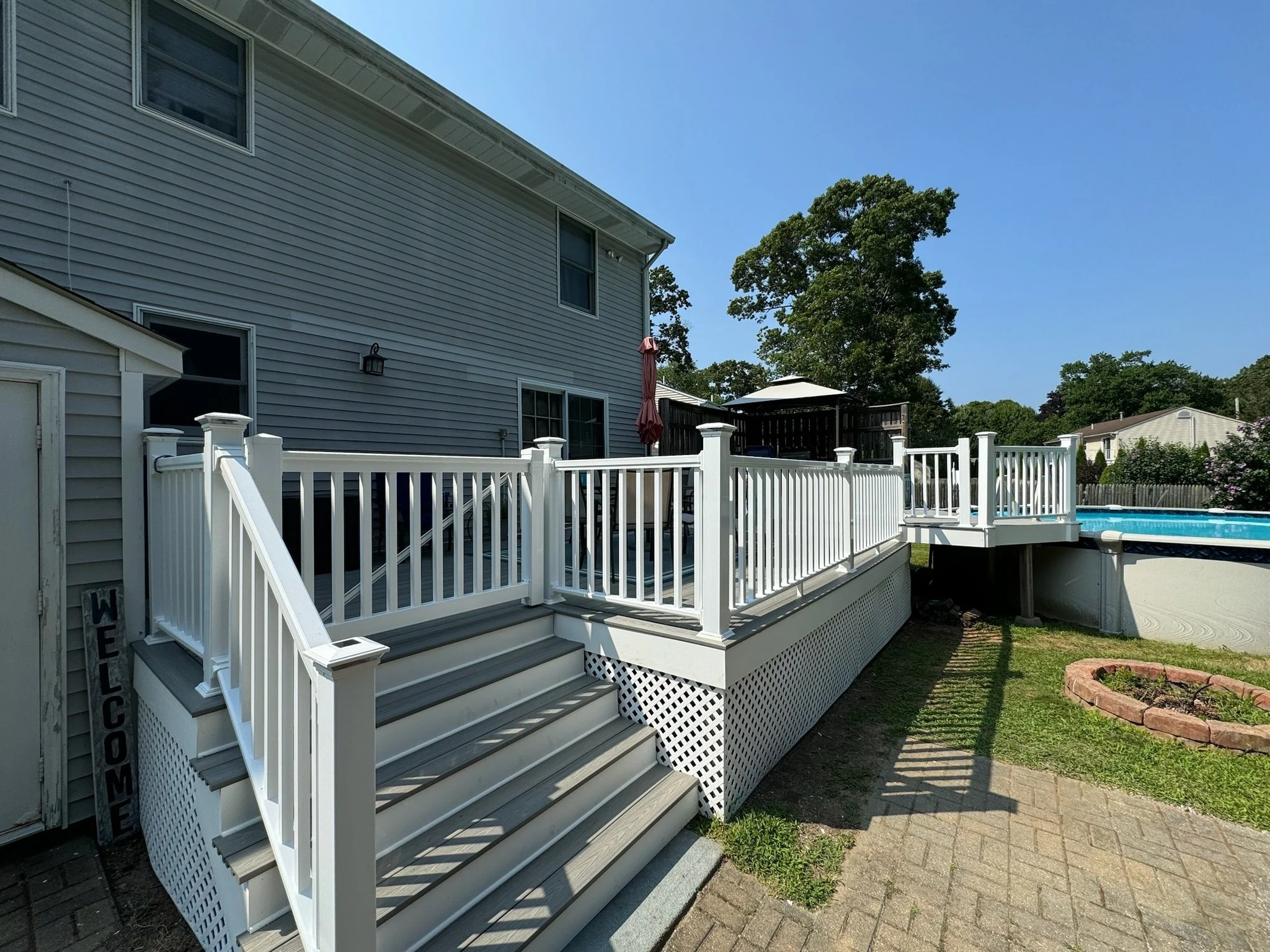 This project started with the demo of existing decking and railings. We then installed Deckorators Saltwater composite decking and Deckorators vinyl railings.